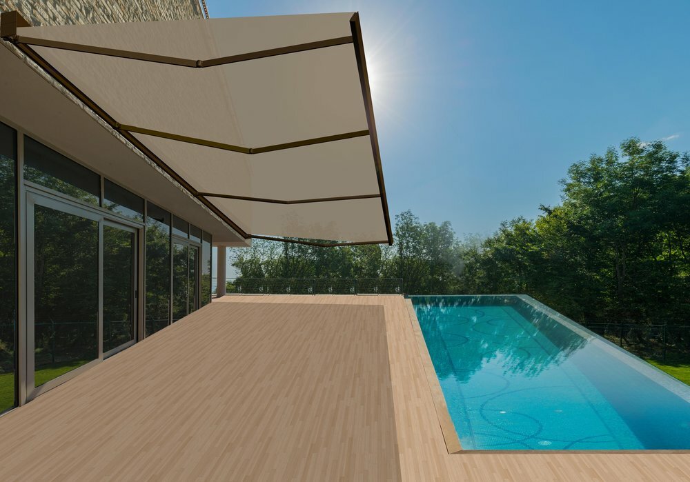 Маркиза с максимальном выносом для закрытия больших террас и площадей. Усиленные узлы маркизы и несущая балка гарантируют надежность маркизы.